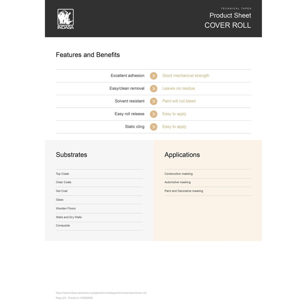 Indasa Cover Rolls offer a convenient and efficient solution for protecting surfaces during painting applications. These single-edge, pre-taped masking film rolls combine a strong adhesive with a protective polyethylene film. Easy to apply, the cover rolls adhere firmly to surfaces and unfold to shield against paint overspray. The natural rubber tape ensures excellent adhesion and mechanical strength, while the film's static cling and solvent resistance prevent paint bleed-through. The rolls are available in multiple sizes to accommodate various project needs.