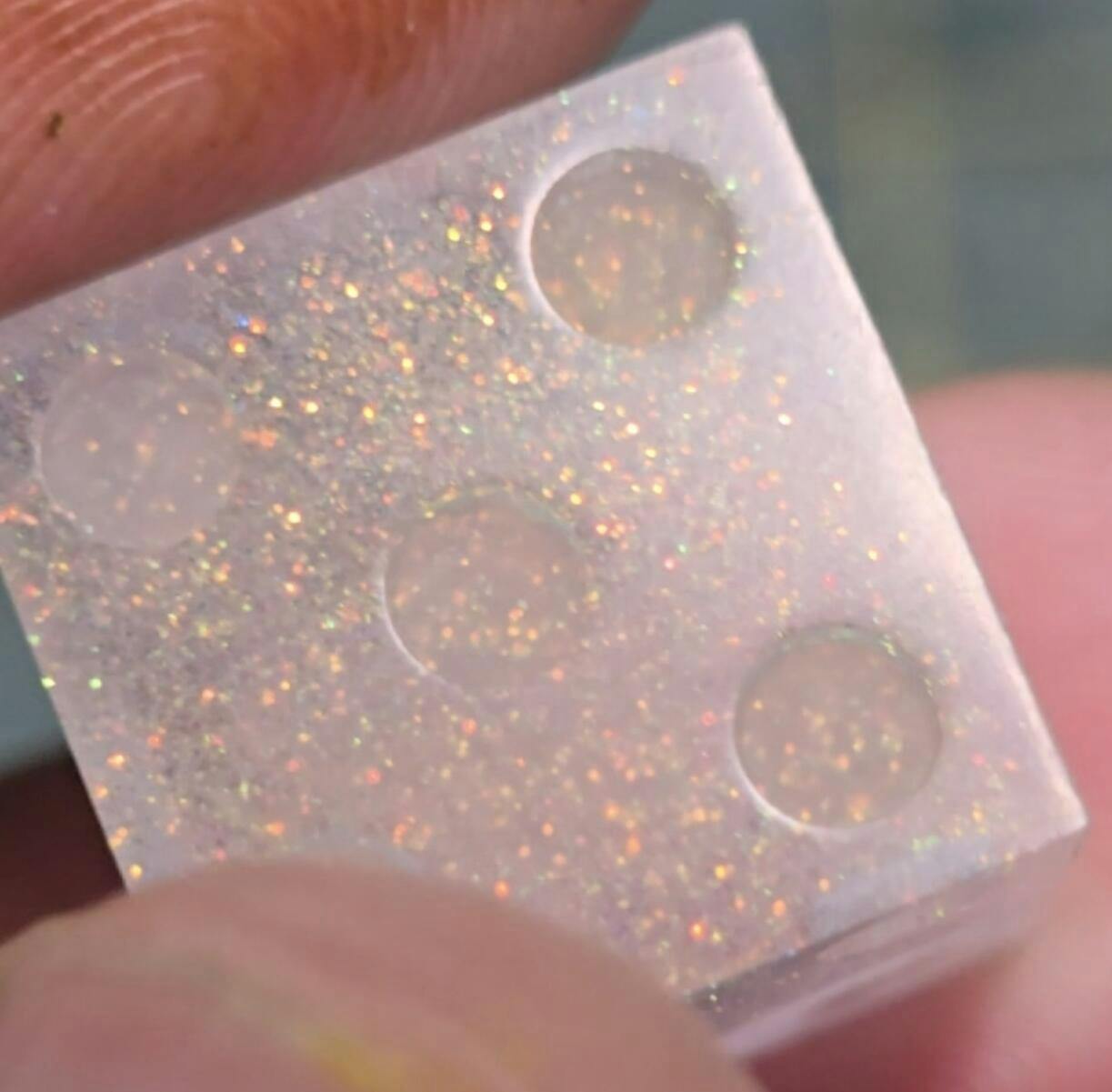 I'm a dice maker and often glitter and additives in general sink in the process unless careful countermeasures are taken. This however stayed suspended without any of those countermeasures leaving a beautiful evenlydispersed shine.